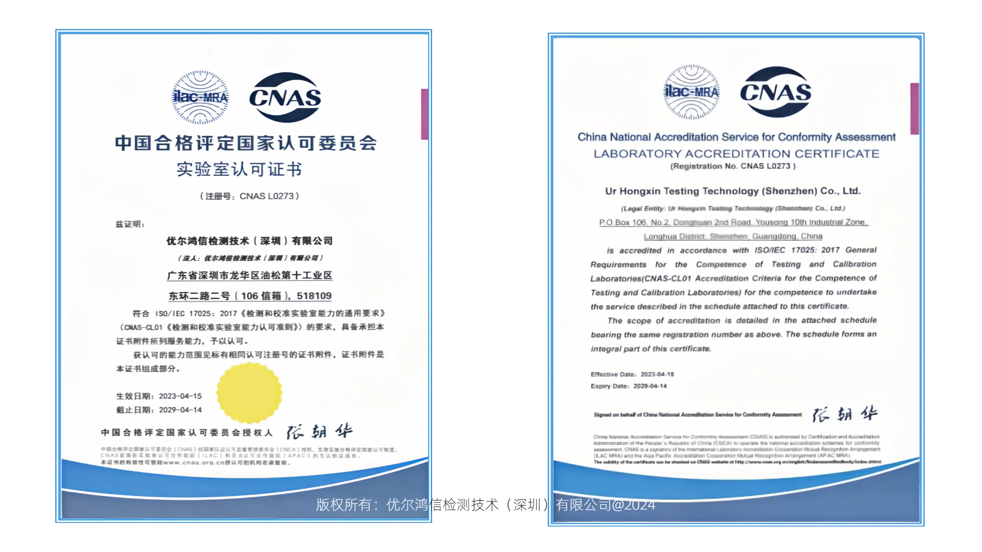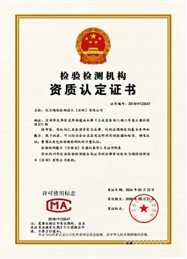 优尔鸿信取得中国国家合格评定委员会(CNAS) 的初次认可,CNAS证书编号为CNAS L0273.