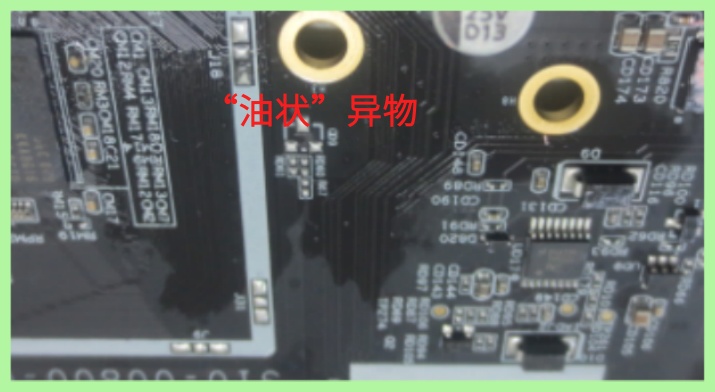 客户反馈,库存中有块PCB主板表面出现了“油状”异物(见下图),且部分元器件金属部位出现了轻微腐蚀,故送检实验室解析“油状”异物成分,并判断腐蚀原因。
