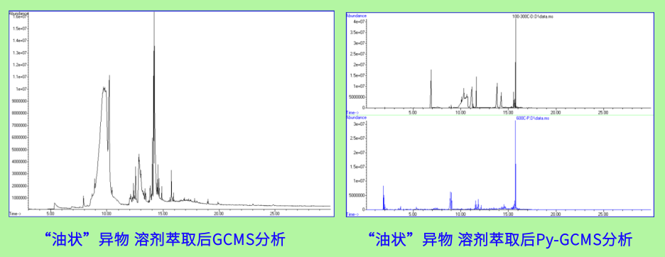 客户在送检前,已做过红外光谱测试,因“油状”异物是较为复杂的混合物,红外谱图无法判断其具体成分,要求实验室采用其它更高阶的分析方式。