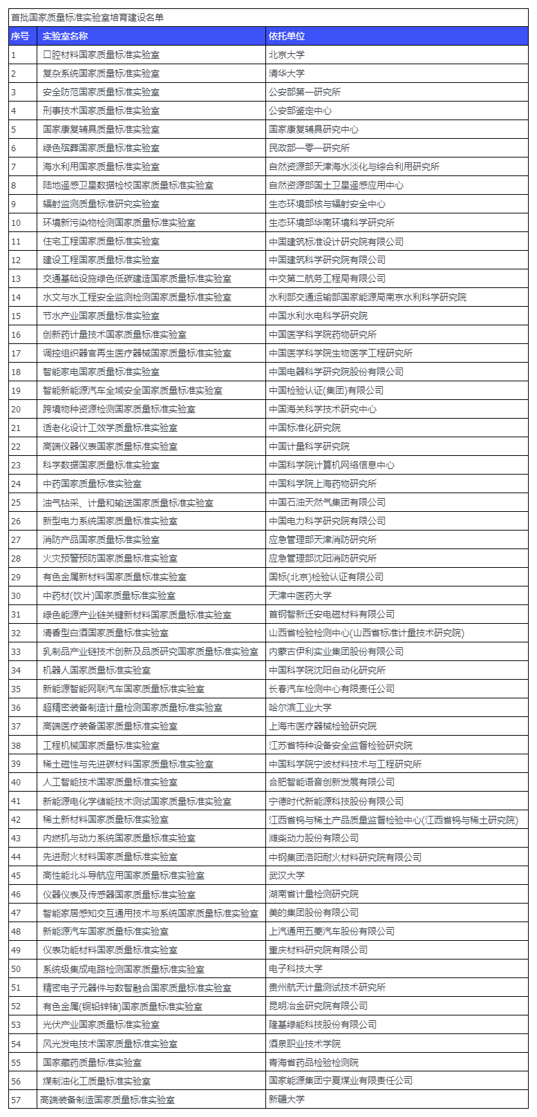 市场监管总局办公厅发布第一批国家质量标准实验室培育建设名单(共 57 家),覆盖高端制造、集成电路、人工智能、生物医药、新材料、仪器仪表等重点领域。