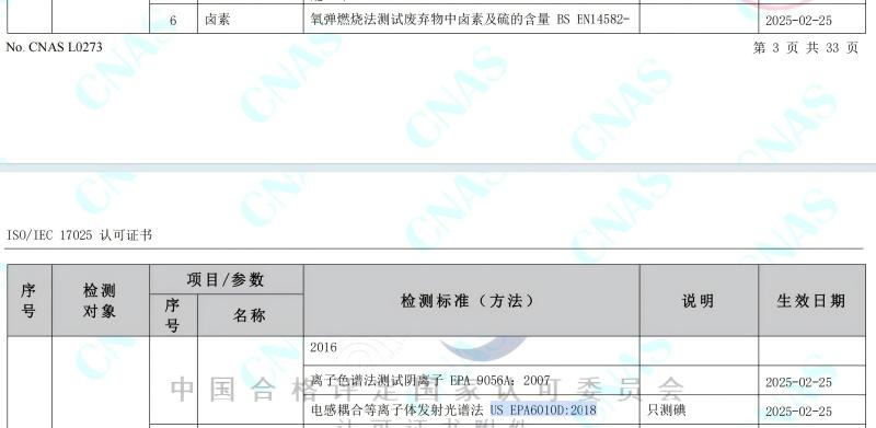 氧弹燃烧-离子色谱法:样品在高压氧中燃烧,卤素转化为离子,经离子色谱分离和电导检测,定性定量分析。适用于高分子材料、电子废弃物等复杂样品,灵敏度高。